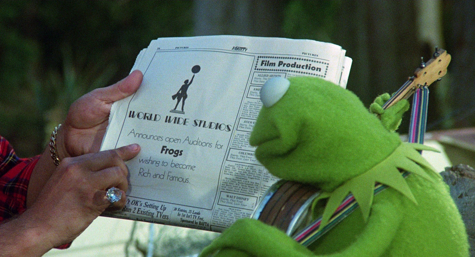 - In The Muppet Movie, the "Rich and Famous" ad in Variety that Bernie the Agent shows to Kermit features a Film Production column listing plans for various film entities (omitting terms like "Pictures" or "Studio"), including Walt Disney.