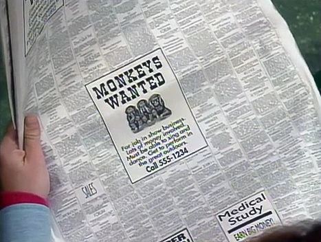 - Gina helps Joey and Davey Monkey look for a job in Sesame Street Episode 3312. One of the newspaper want ads features the headline "Monkeys Wanted" accompanied by an illustration of the three wise monkeys.