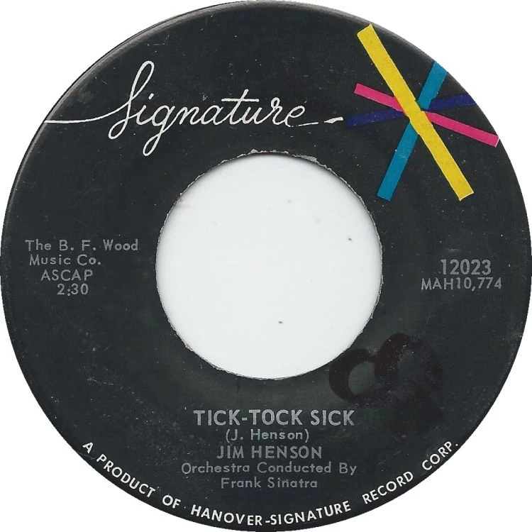 βThe 45 record was recorded under the Signature label ("A product of Hanover-Signature Record Corp."). The main song was called "Tick-Tock Sick" and the flip side had a song called "The Countryside". Both were written by Jim himself. At the time Jim made the recording, he was living in Washington, DC and performing Sam and Friends on local television as well as making appearances on variety shows and making commercials for various products. It is not clear that "Tick-Tock Sick" was used for anything in particular, but it sounds like it may have accompanied puppet performances on Sam and Friends or a variety show. The theme of the song, the relentlessness of time, was later explored by Jim in his 1964 short film, Time Piece, and touched on again with the thirteen hour clock in Labyrinth.