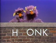 After sounding out the word "honk," several Honkers suddenly appear and honk their noses. The left half of the monster then honks the right half's nose (and hurts him).