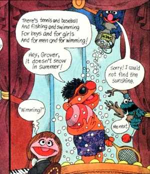 - In "Seasons," Ernie, representing summer, mentions fishing and swimming. His next line is "The beaches are open / For men and for wimming." Prairie Dawn questions, "Wimming?"