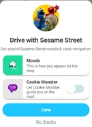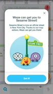 In June 2019, Waze introduced Sesame Street content. Cookie Monster's voice was added as one of the voice options, and the "Moods" feature allowed the user to choose an icon for their car that looks like Cookie Monster, Elmo, or Oscar the Grouch. A feature was included that provides directions to Sesame Street -- or, at least the honorary Sesame Street at 63rd and Broadway that was established in May.