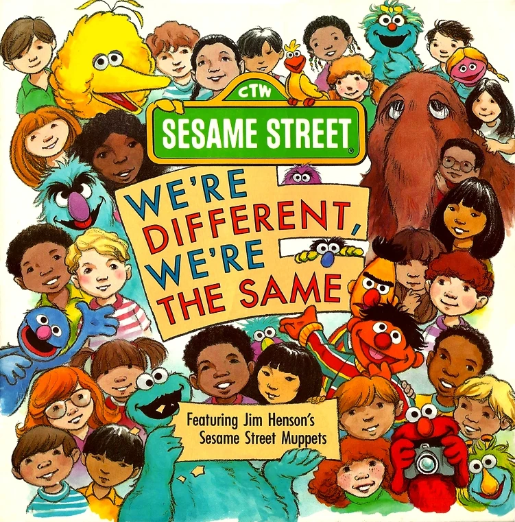 We're Different, We're the Same is a book stressing how people and Muppets may differ in size, shape, color, and other external details, but remain fundamentally the same. A series of pages contrast illustrated snapshots of different noses, mouth, hairstyles, and other features, followed by a page showing a mass of people enjoying similar activities.