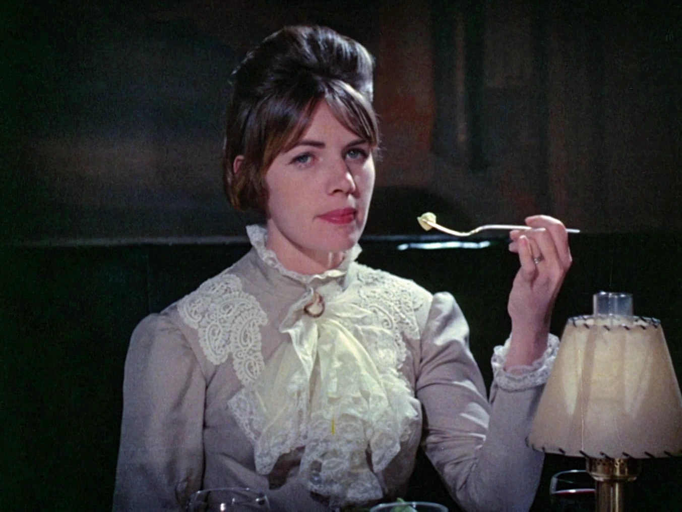 Like the man, but to a lesser extent, the wife's clothes and persona change throughout the short. After chastely kissing her husband and preparing dinner, the pair then shift through different period garbs. Later, as the man gazes at the stripper, footage of the wife is intercut, as she unromantically and drably drops her garments, which include a pad-lock covered corset-device.
