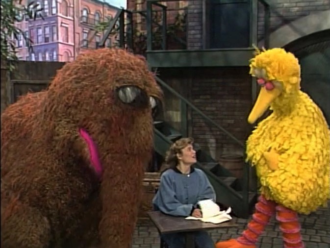 Big Bird and Snuffy approach Gina on a windy day, singing the theme song of their new enterprise - Windbusters, where they stop the wind from bothering people. They help Gina keep her papers in place by placing a large brick on them.