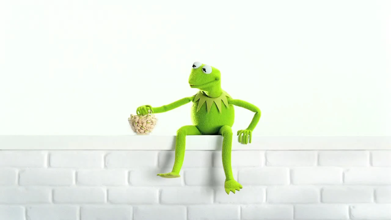 Wonderful Pistachios are advertised with a TV campaign called "Get Crackin'", featuring various well-known celebrities showing off how they crack open Wonderful Pistachios. Kermit the Frog appears in a 2011 "Get Crackin'" ad as a promotional tie-in with The Muppets. He shows off the green color of the pistachio and the "green" biodegradable container (shell) that the pistachios come in. "Kermit does it 'cause he's green", according to the voice-over in the ad.