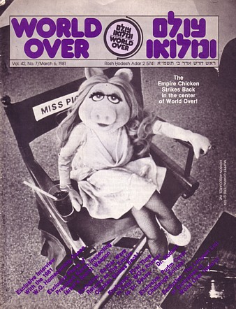 World Over was a magazine for Jewish children published by the Board of Jewish Education of Greater New York from the 1940s through the 1980s. The March 6, 1981 issue featured a one-page interview with Miss Piggy about the practice of keeping kosher.