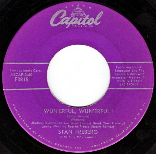 "Wun'erful, Wun'erful" is a 1957 Stan Freberg single for Capitol Records spoofing The Lawrence Welk Show. The sketch began as a routine on The Stan Freberg Show, used in the August 11, 1957 broadcast, expanded for two sides with an epilogue. The record version was utilized on Sam and Friends, edited to fit the show's running time, broadcast on September 4, 1959.[1]